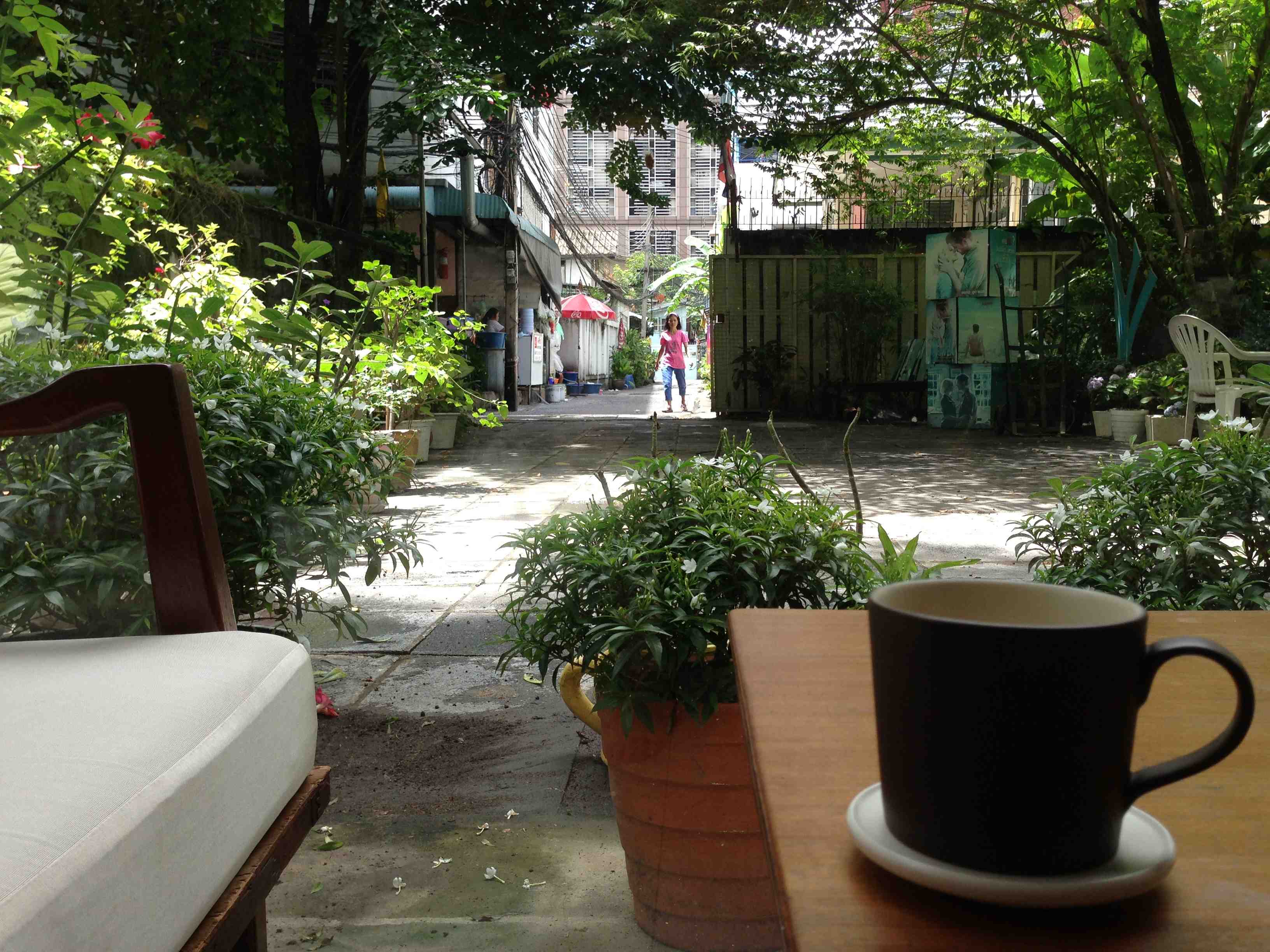 I just found the most glorious coffee shop in Bangkok. You could totally miss it if you didn’t know how to get here. Thanks to NomadicNotes, I am here. It’s tucked within an alley amongst street vendors and high-rise buildings right in the center of town. It’s called Re-Café. The shop is a bungalow set in a courtyard with flowerpots all around its large windows, 50’s era design overlooking the yard and alleyway. I’m finding it’s a great place for a writing break.