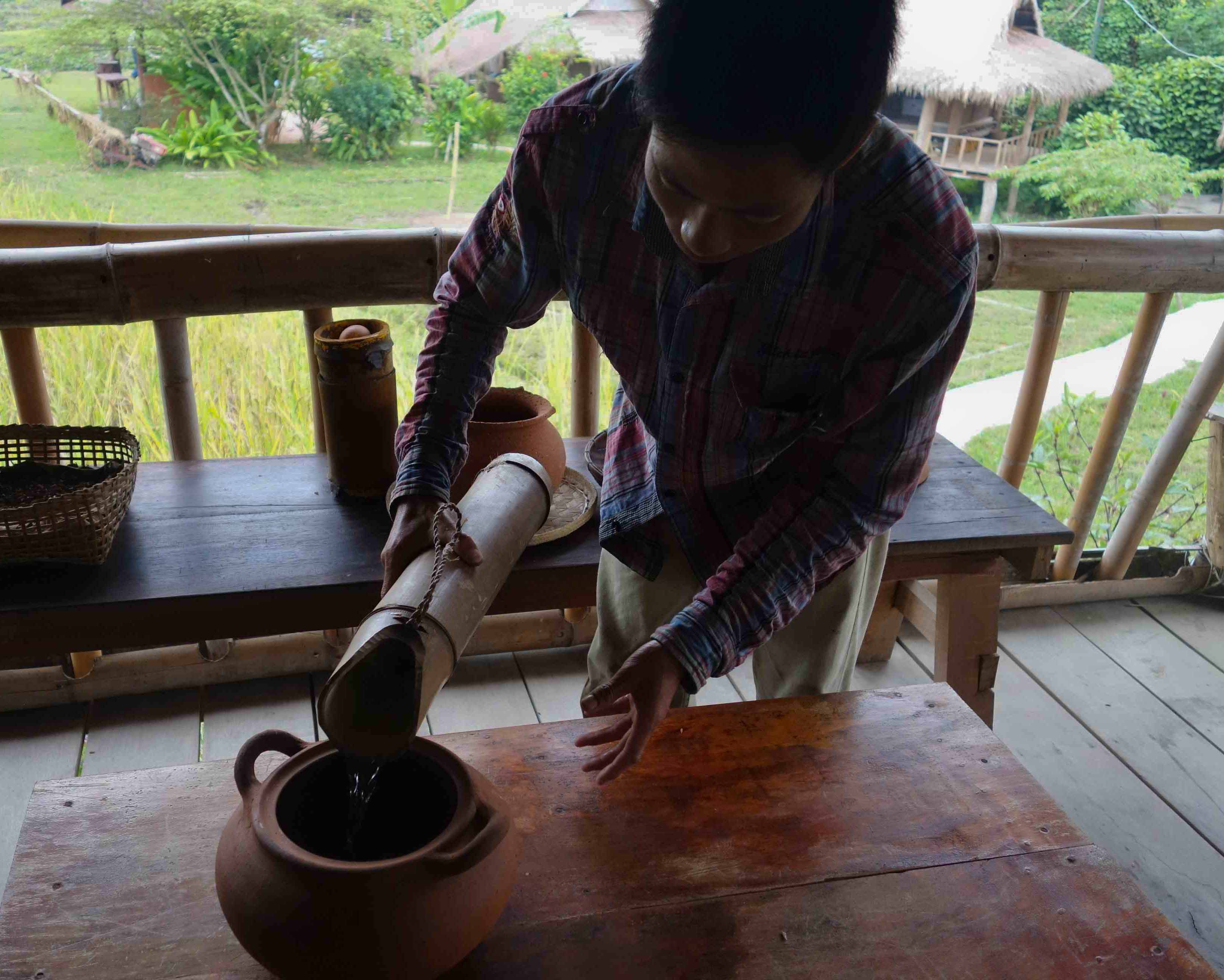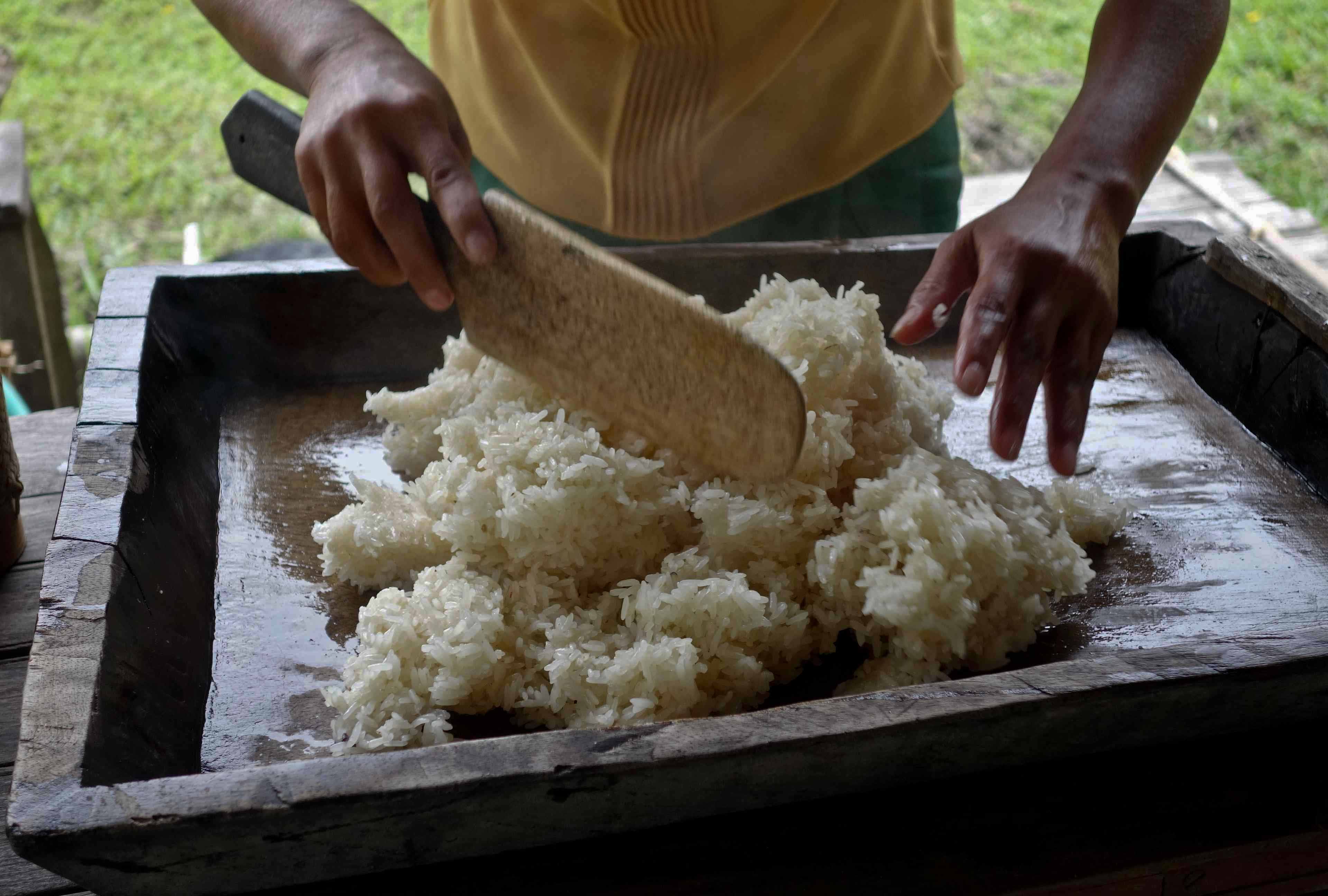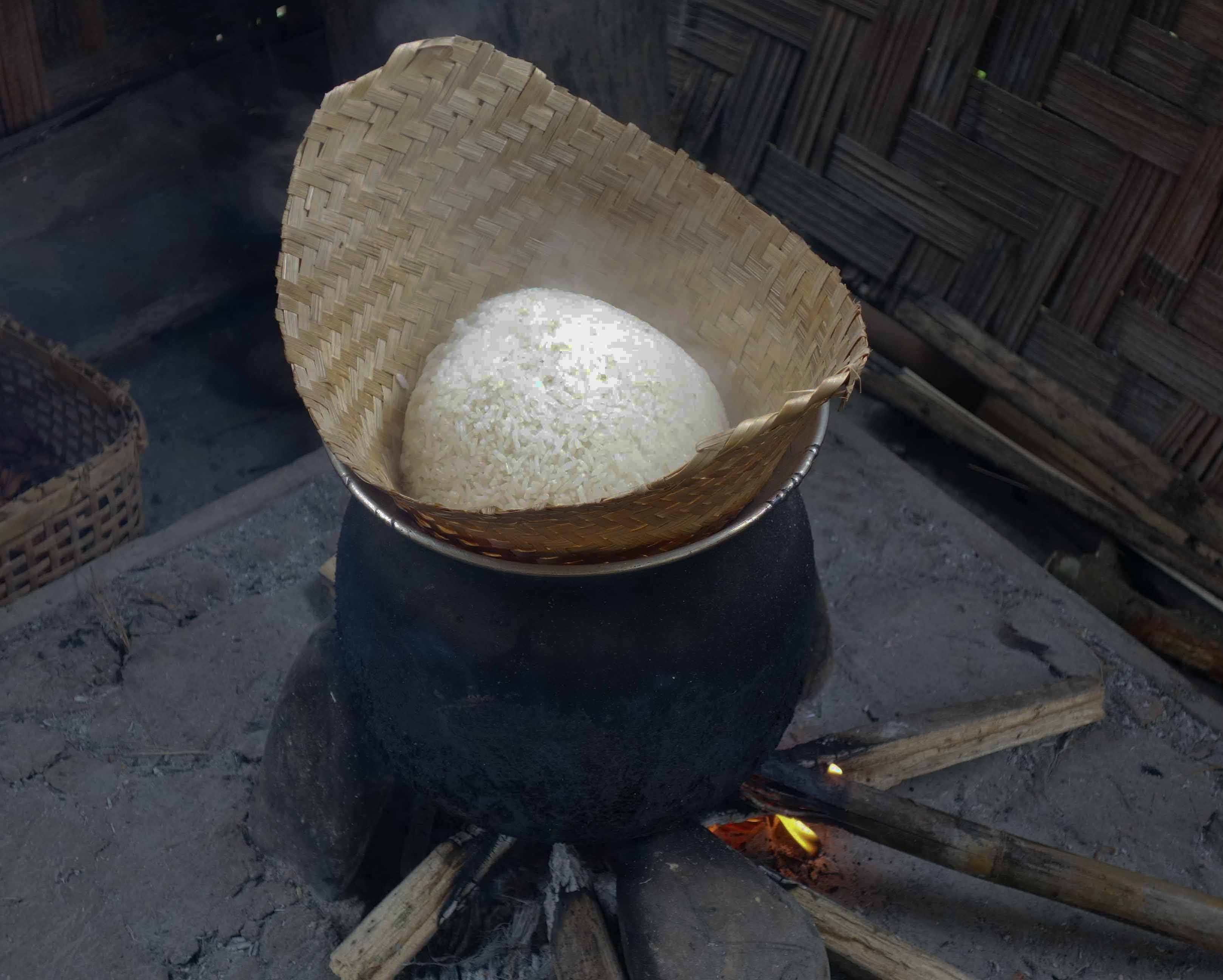 Step Thirteen: Steam the rice. Enough rice will be prepared in the morning for breakfast and lunch, and it takes 25 minutes to cook. Turn over once. The fire is made of wood and dry bamboo. Sticky rice is a staple food and is eaten at every meal. An adult eats 20 kilos of sticky rice a month!
