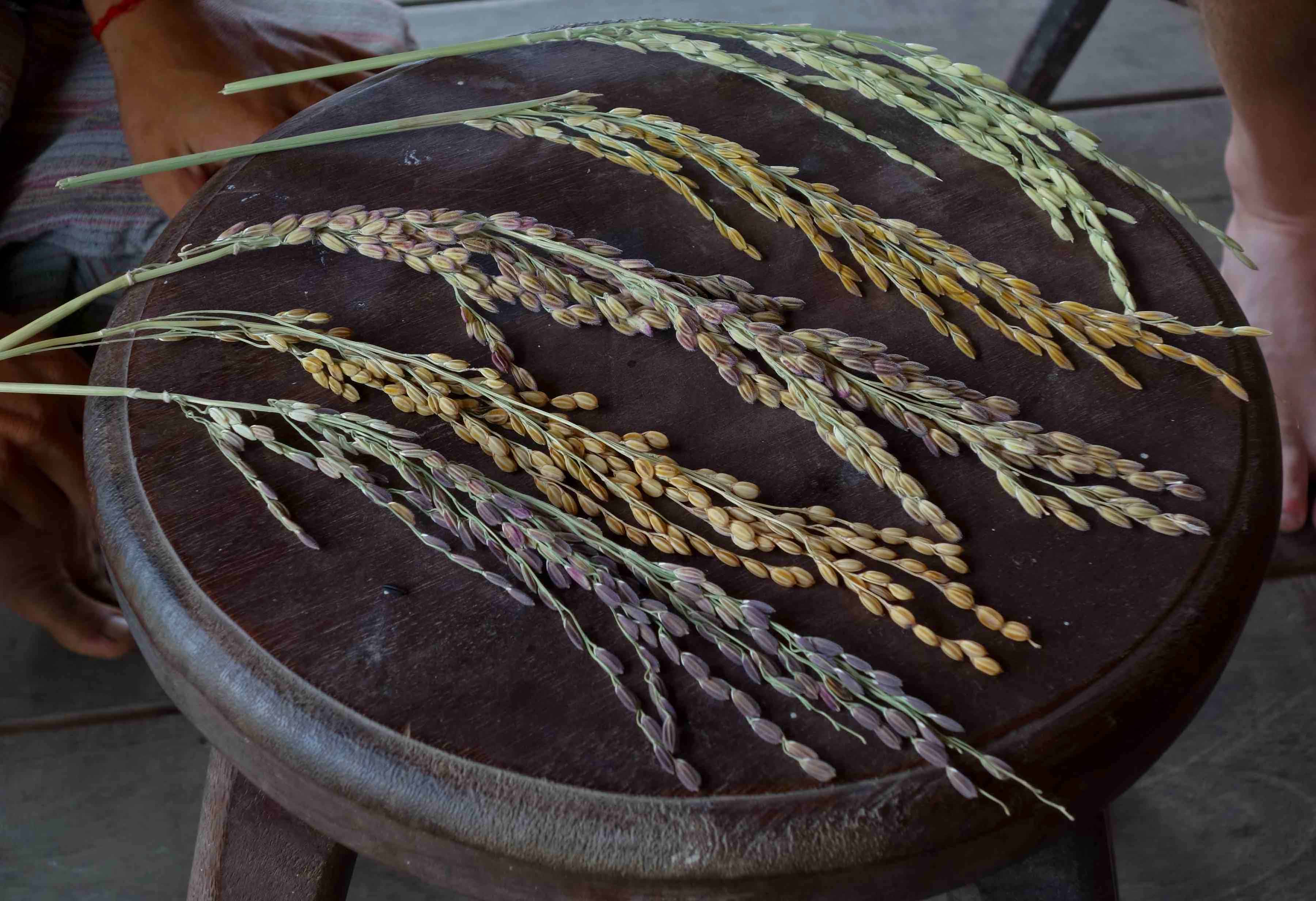 Step Seven: Remove the grains from the stems by threshing. Empty husks will stay on the bunch and will be given to the buffalos during the dry season. The good rice is scooped onto the straw mat for further cleaning.